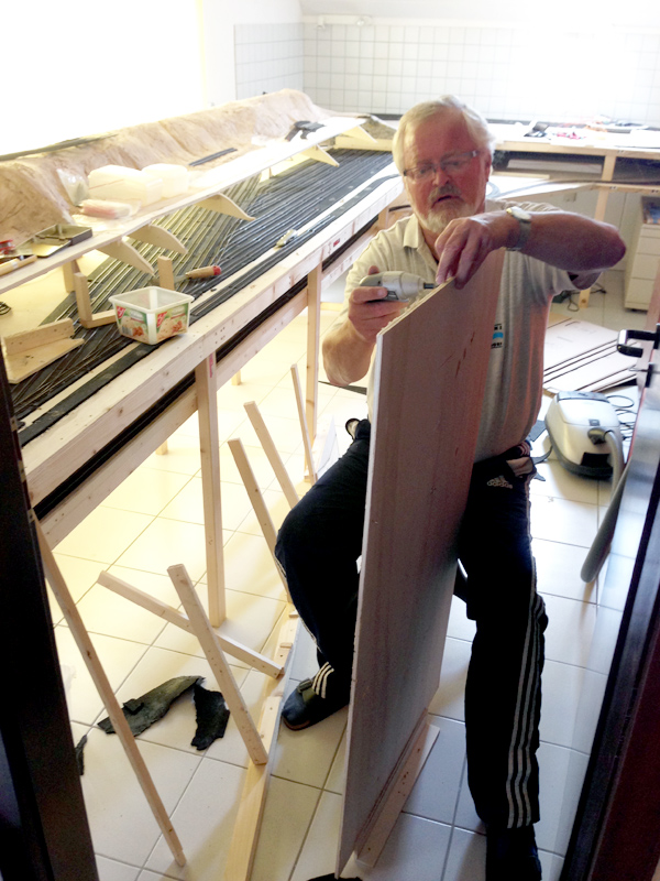 Zum Auftakt ging es dem Gebirge aus Gips „an den Kragen“. Nach und nach verschwindet das Gebirge… … und auch die ersten Gleise müssen weichen. Die landen dann in Kisten. Weiter geht es an einem anderen Anlagenschenkel. Auch die komplette Verkabelung wird demontiert. Wenn man(n) beim Entlöten nicht aufpasst, gibt es auch mal „Brandgravuren“ auf dem Arm. Erste Teile des Grundrahmens sind schon weg. Auch Trassenbretter landen auf dem Boden und danach im Müll. Und so wird es von Stunde zu Stunde… … immer weniger und weniger… … was noch an die alte Anlage erinnert. Hier war mal die höchste Erhebung der Anlage. Auch nebenan verschwinden Berge und Gleise. Auch im hohen Alter wird noch kräftig angepackt. 😉 Und dann ist alles weg. Kaum noch etwas… … erinnert an die Anlage! Auch die Chef-Inspektorin ist von der guten Arbeit ihrer Männer überzeugt. Und schließlich verschwindet auch noch der Schrank an der Wand, um Platz für das neue Projekt zu machen. -